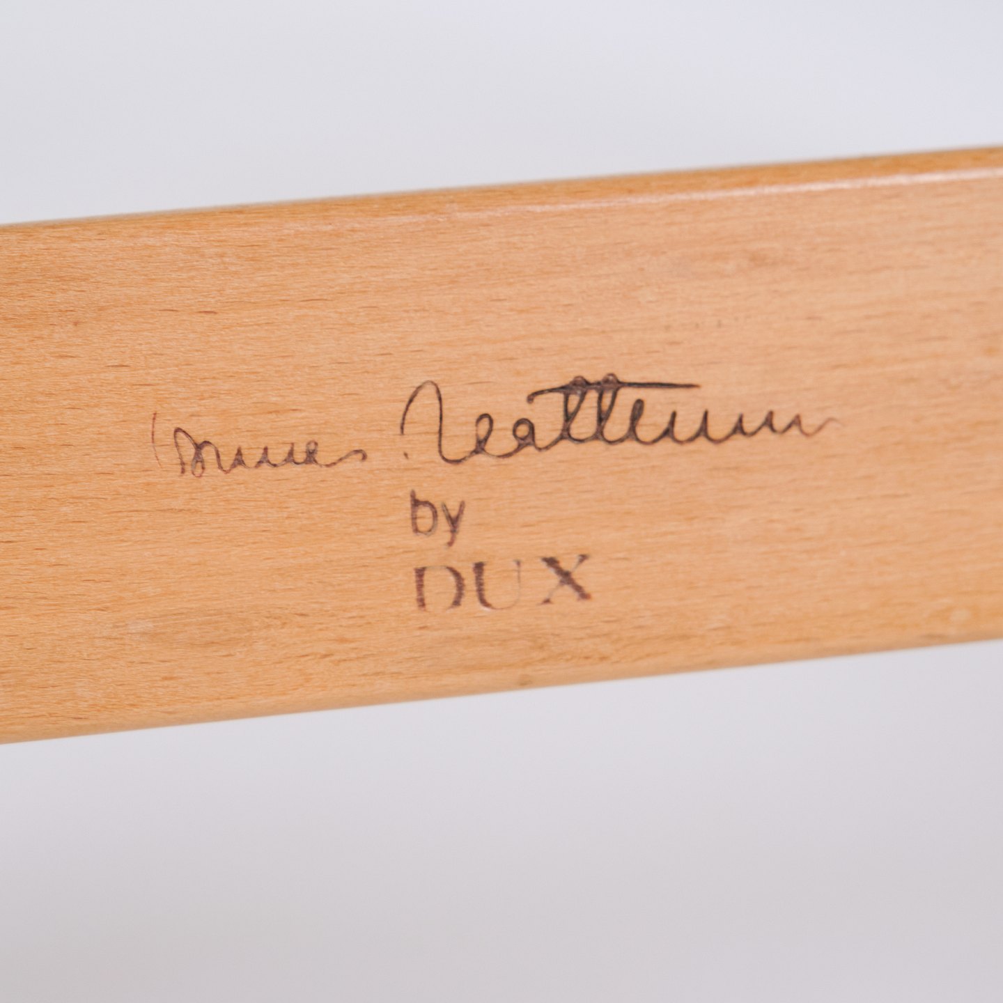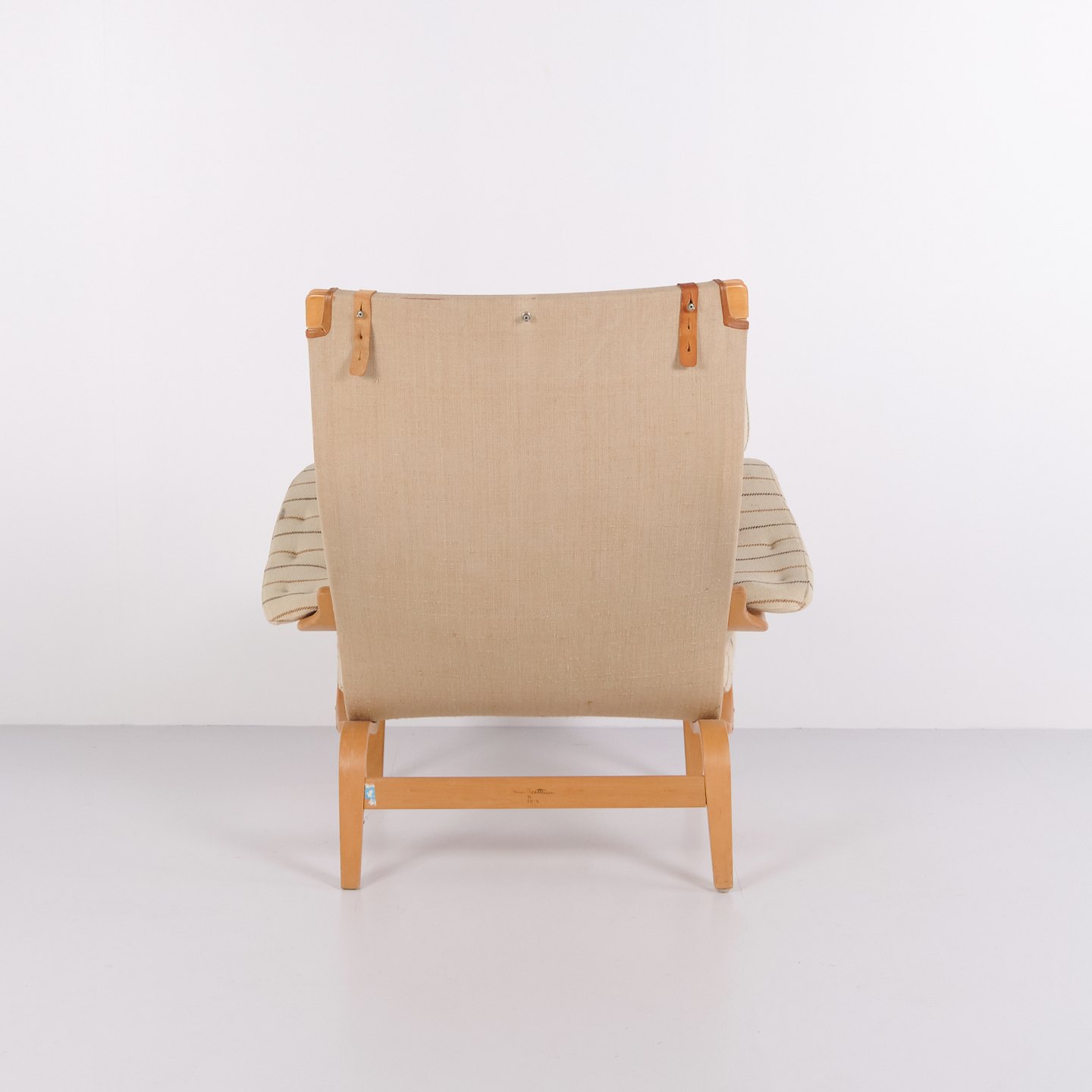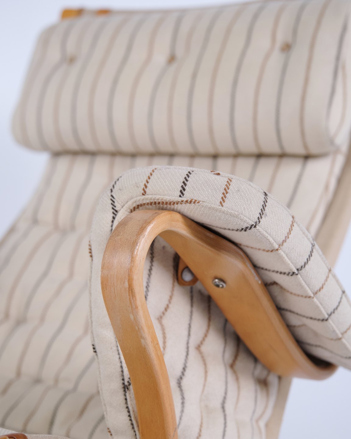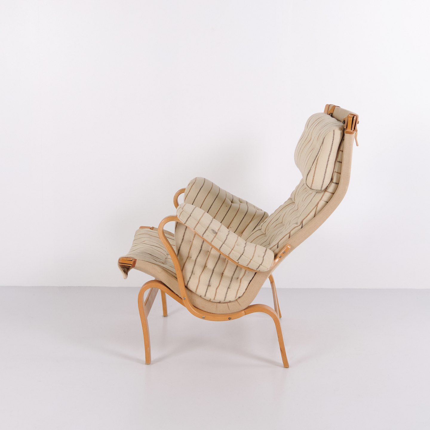 Bruno Mathsson Pernilla armchair model 69 from DUX in striped fabric and beech wood. Classic Scandinavian design from the 1960s.