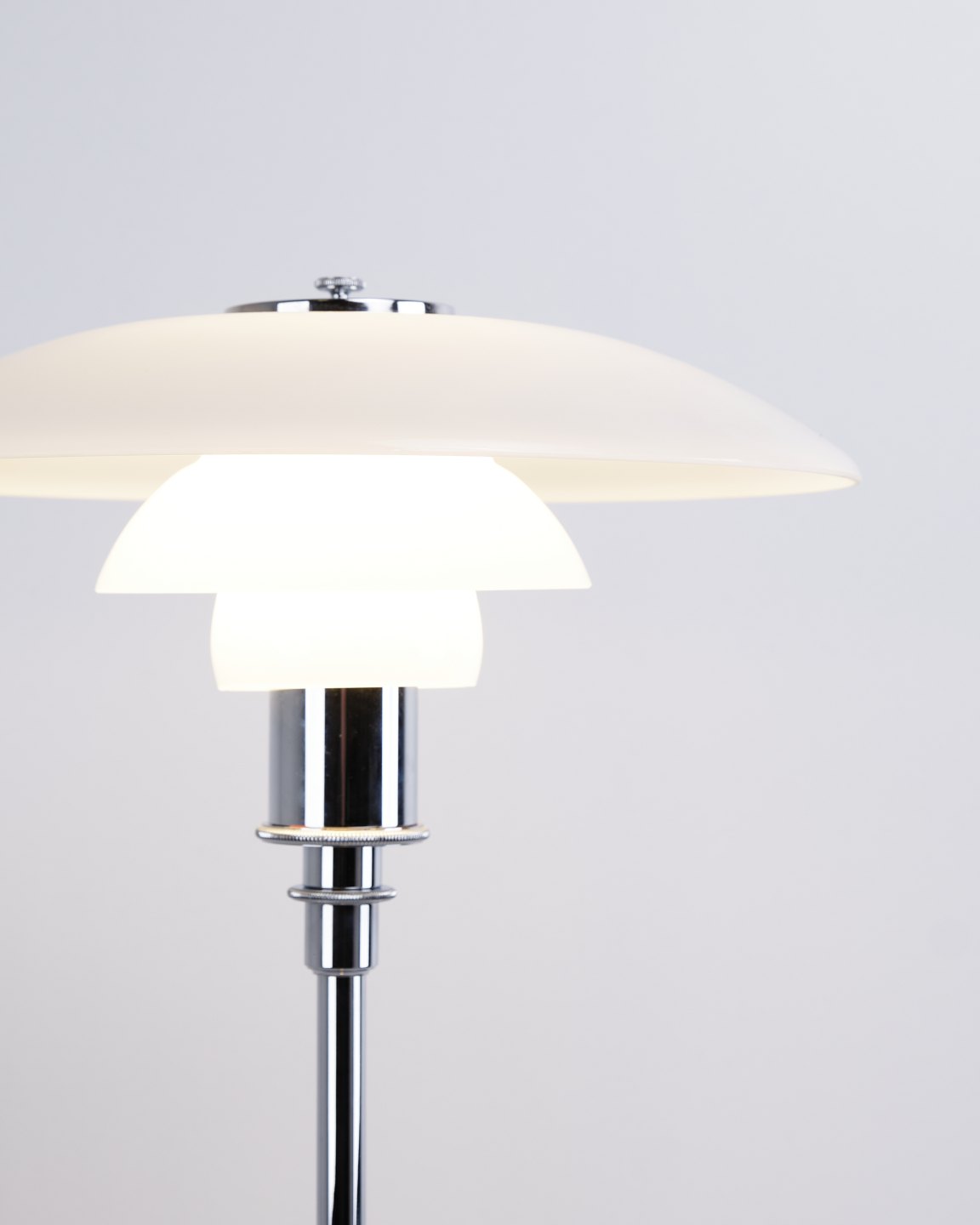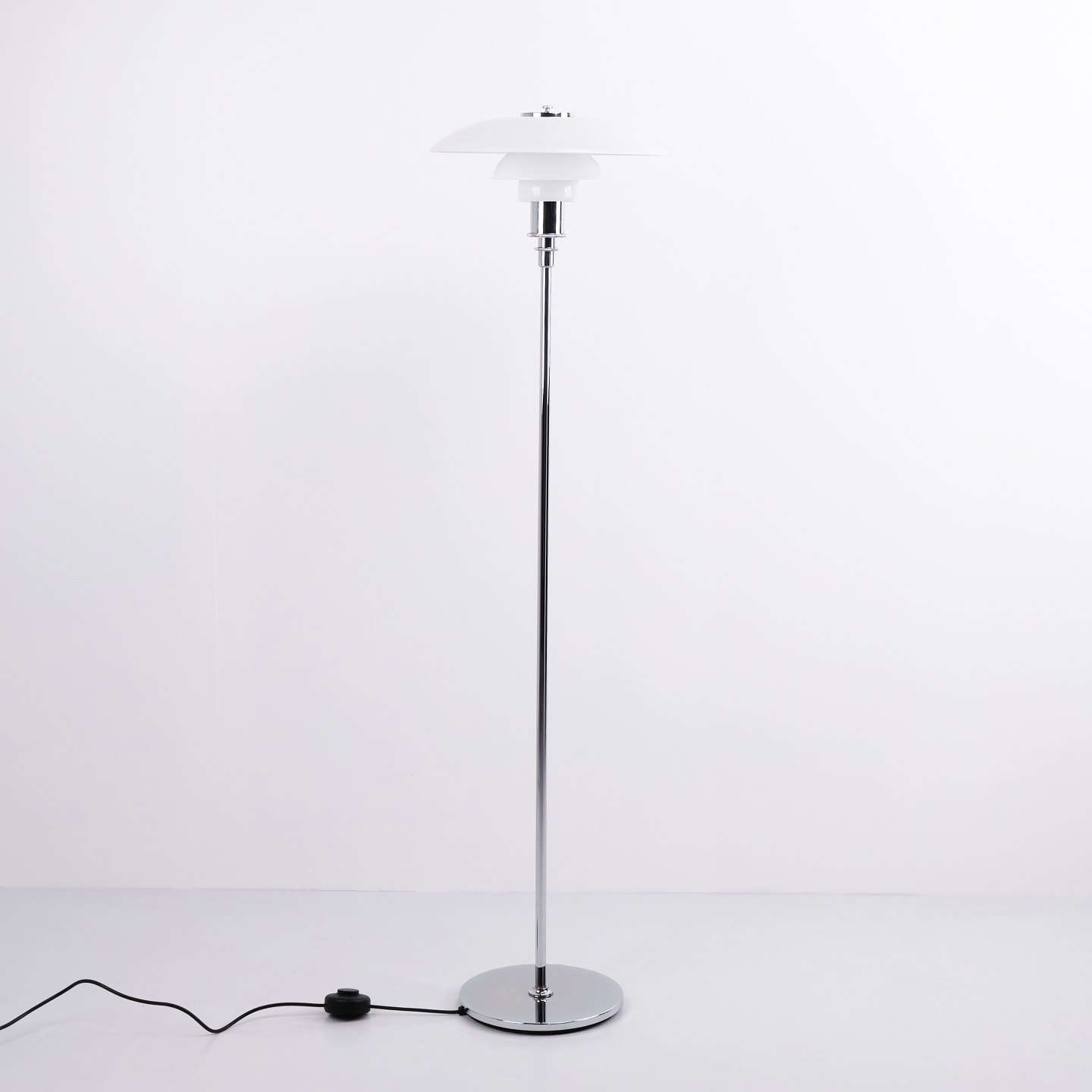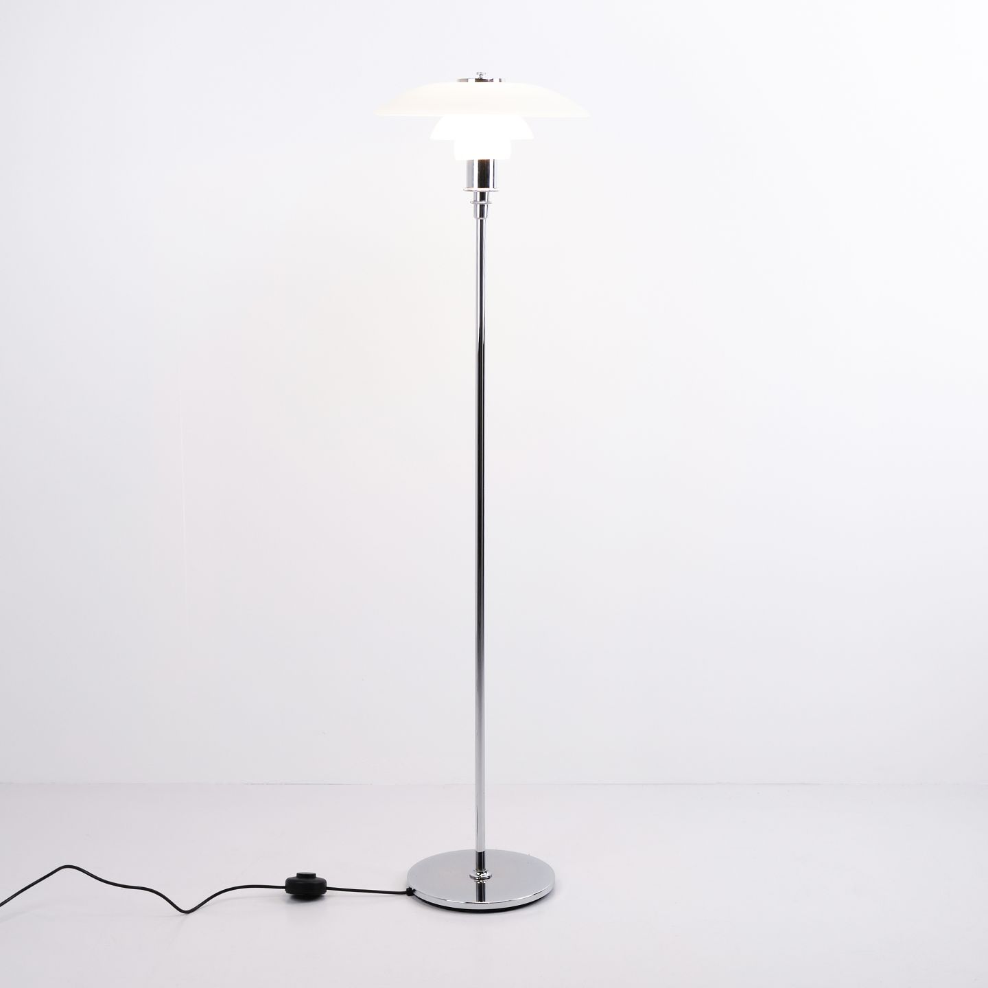 PH 3½-2½ floor lamp in chrome with opal glass from Louis Poulsen. Designed by Poul Henningsen with classic Danish lighting design and an elegant expression.