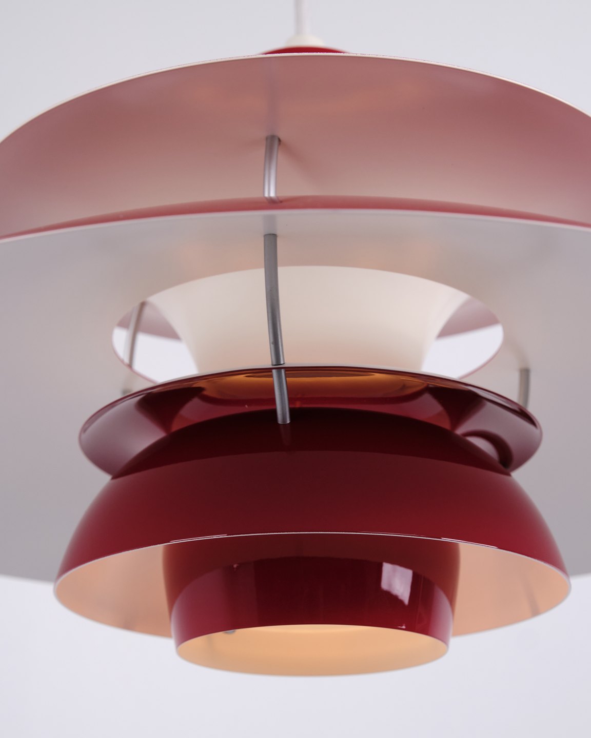 PH 5 pendant in red lacquered metal from Louis Poulsen designed by Poul Henningsen. Classic Danish lamp with glare-free and functional light.