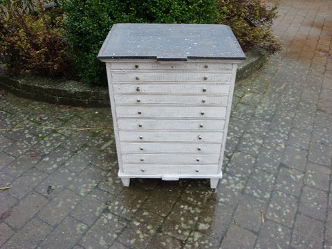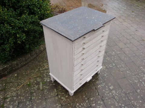 SolgtKommode med mange skuffer i gustavansk grå med flot sort top plade fra år ca 1830